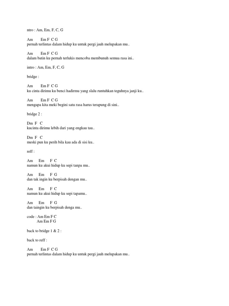 Puas aku mai nuan jadi. Chorus D C Bm Nadainadai agi nuan di tisiku E D A Ka pan sayau ti leladi mataku F Bm Nadai nadai daya keni ka bekira E D G D Ati aku anchur pecah baka kaca ohhhhh Repeat Intro Solo A Bm G D A Bm G Verse 2 Naka meh tu aku mai diri Badu ingat ke nuan agi. Gaji nuan bangat milih suba.